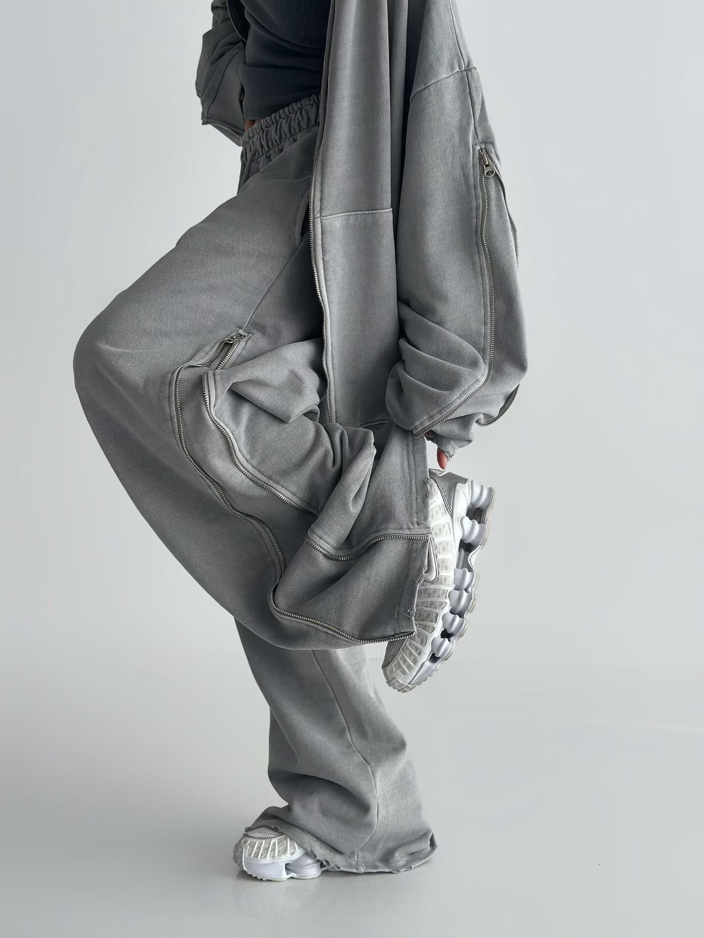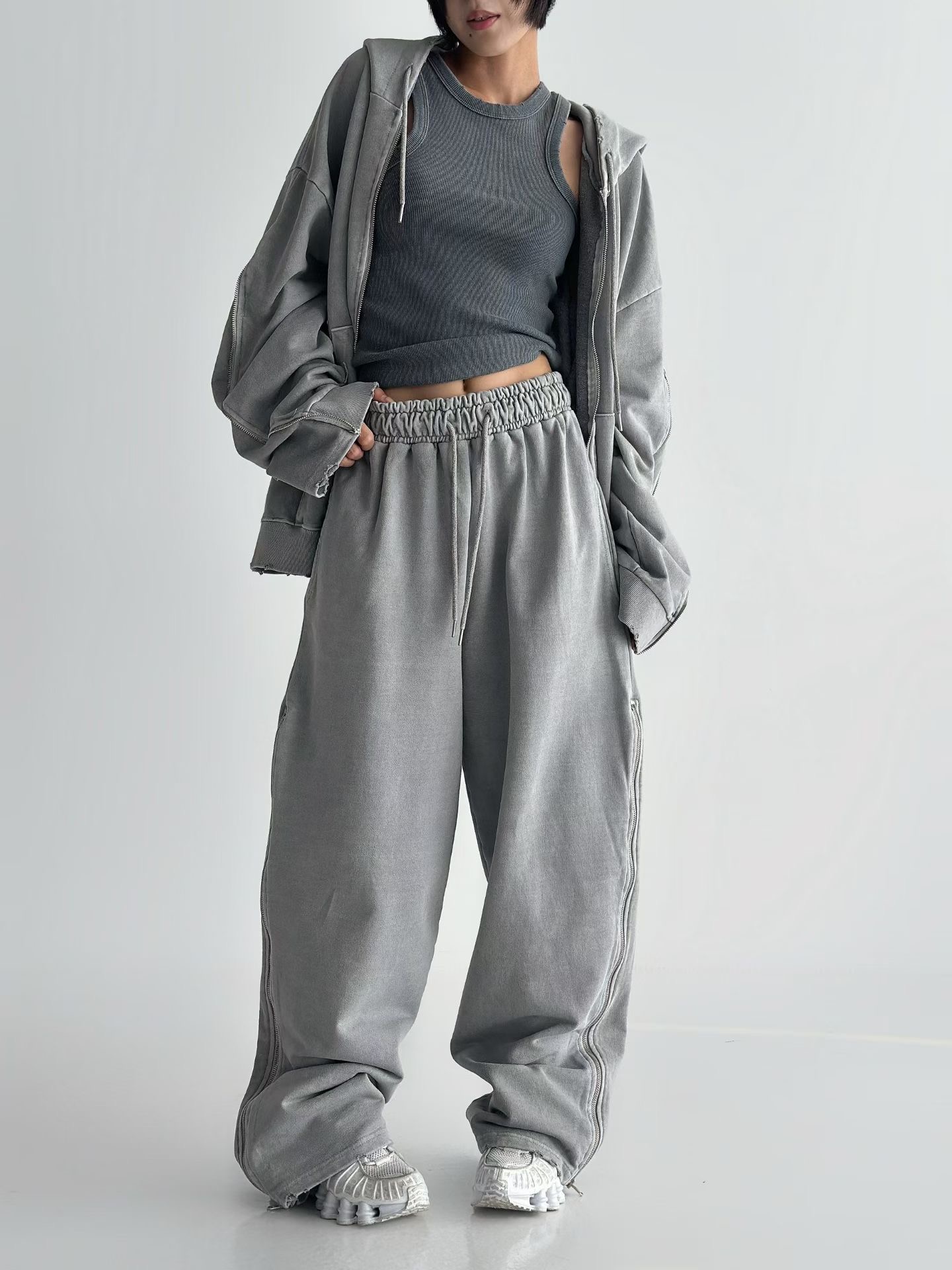 結合重磅水洗做舊工藝,讓深灰色調更具層次感,腰部的鬆緊設計兼顧了穿著的舒適度與街頭態度,是打造高階感成套穿搭的靈魂單品。