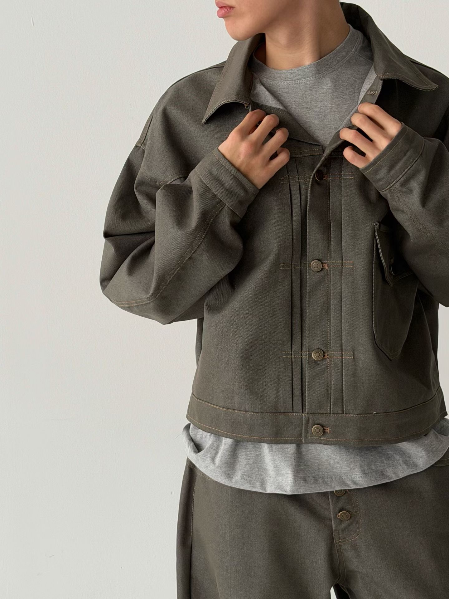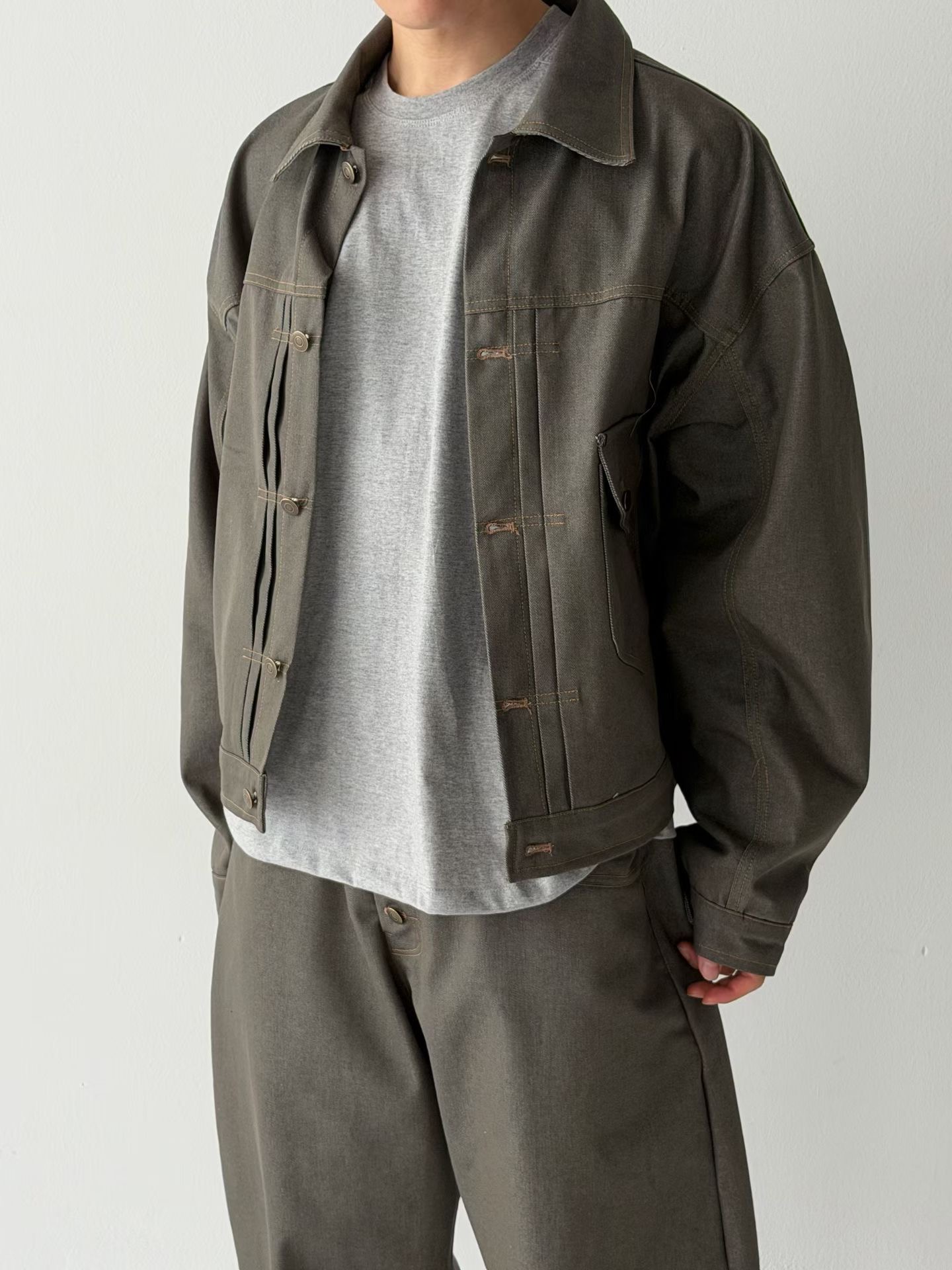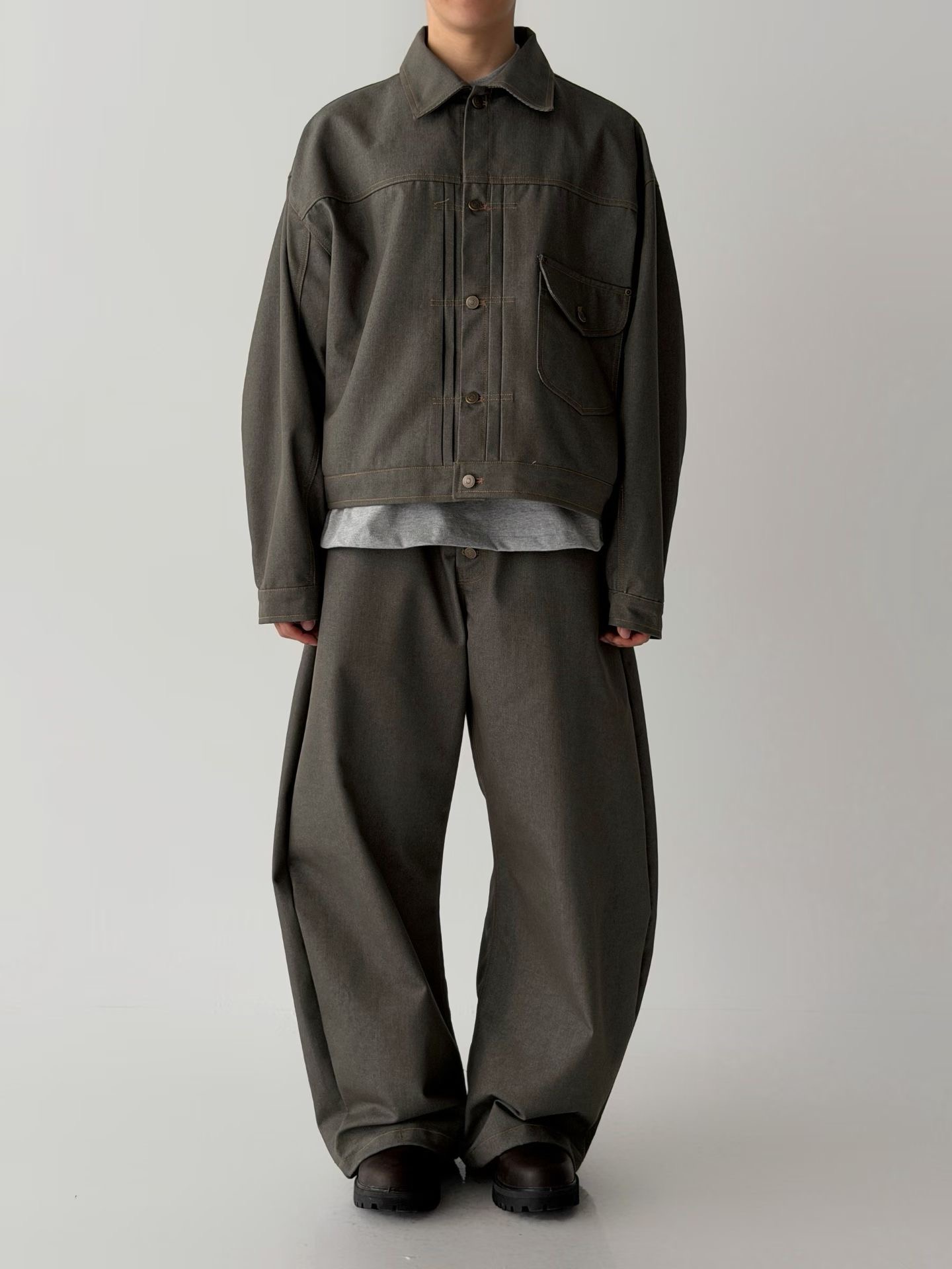 整套穿著展現出強烈的視覺一致性與層次張力,面料厚實且富有韌性,是專為追求獨特細節與廓型美學的穿搭者所打造的質感選品。