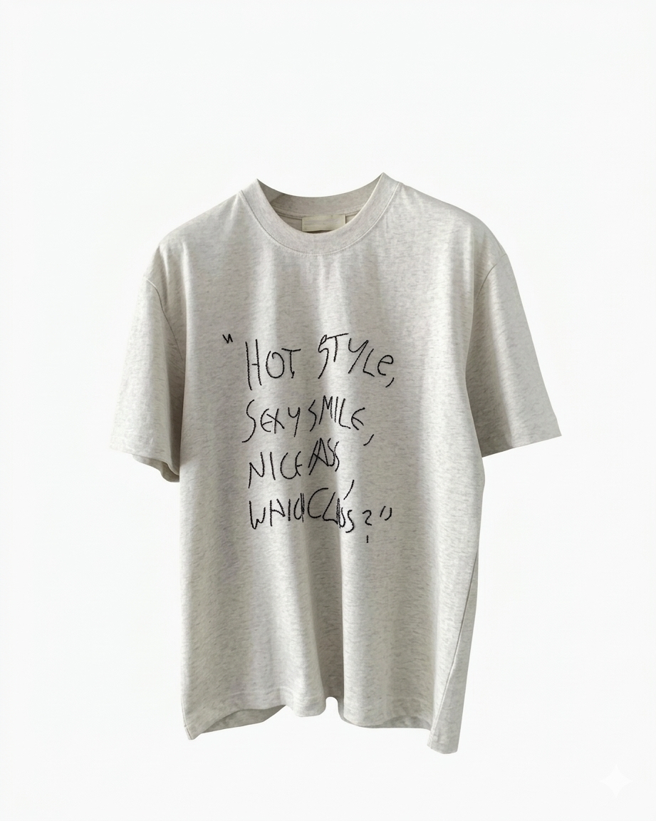 胸前採用手寫感草體文字設計,隨性的筆觸帶點幽默標語,為整體的極簡風格注入了鮮活的靈魂。微寬鬆的版型不挑身材,單穿能展現俐落的高街感,作為襯衫或外套的內搭則能增加穿搭的層次亮點,是日常衣櫃裡最百搭且耐看的個性單品。