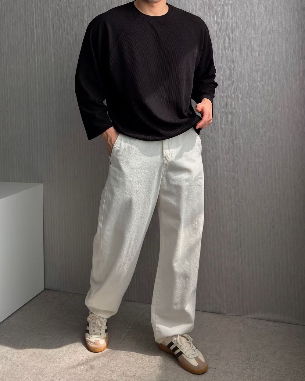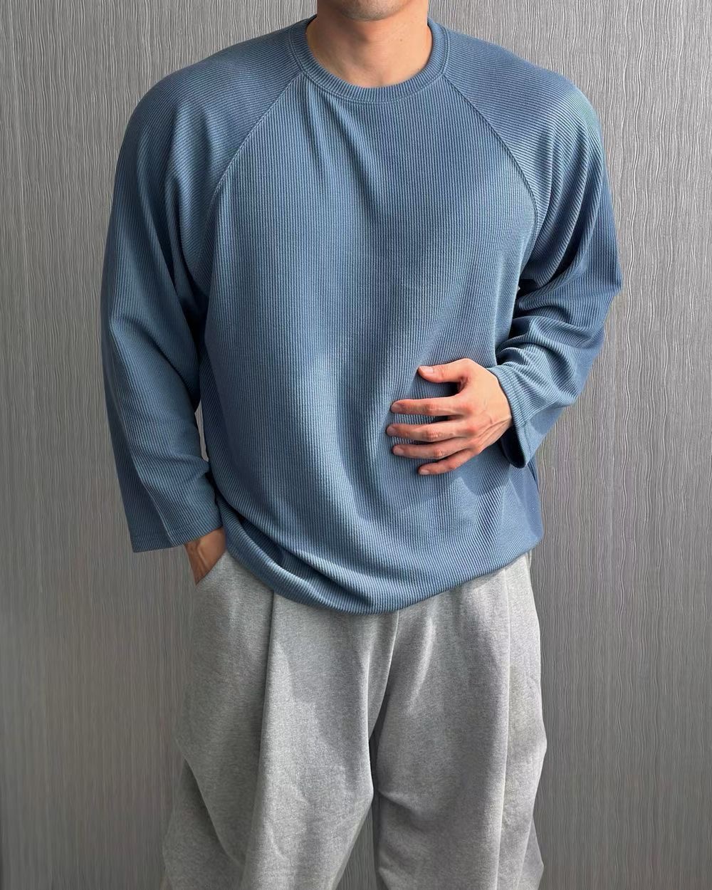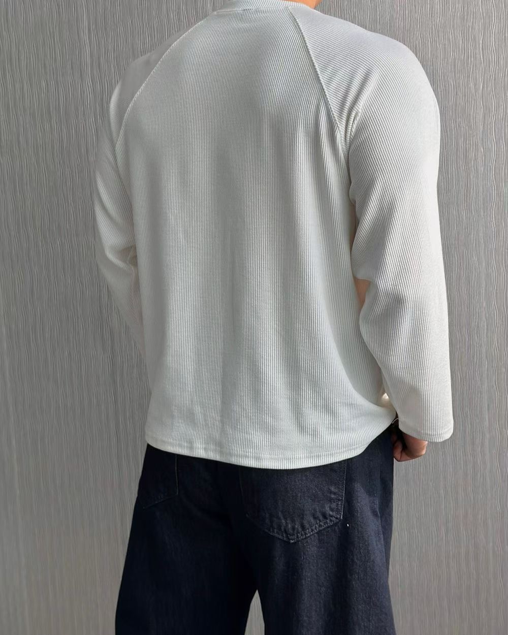 這款薄長T採用細緻的垂直羅紋工法,為純色增添了豐富的立體層次感。