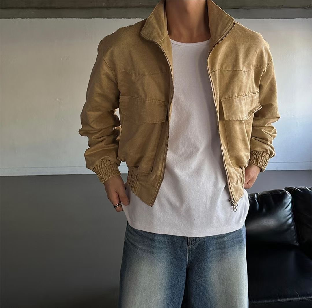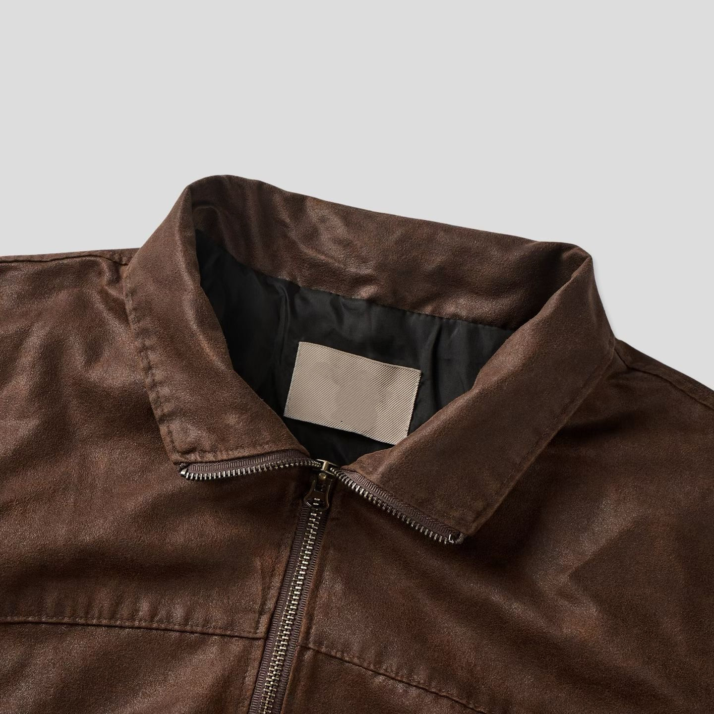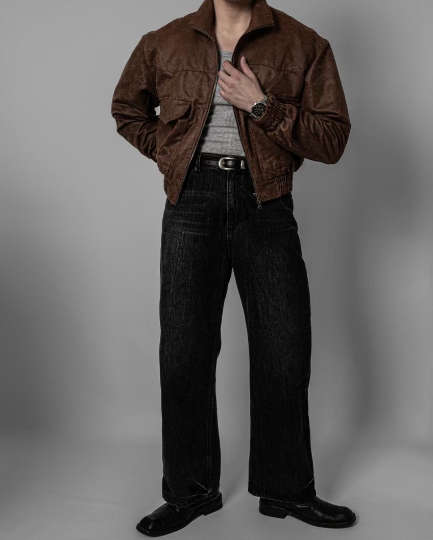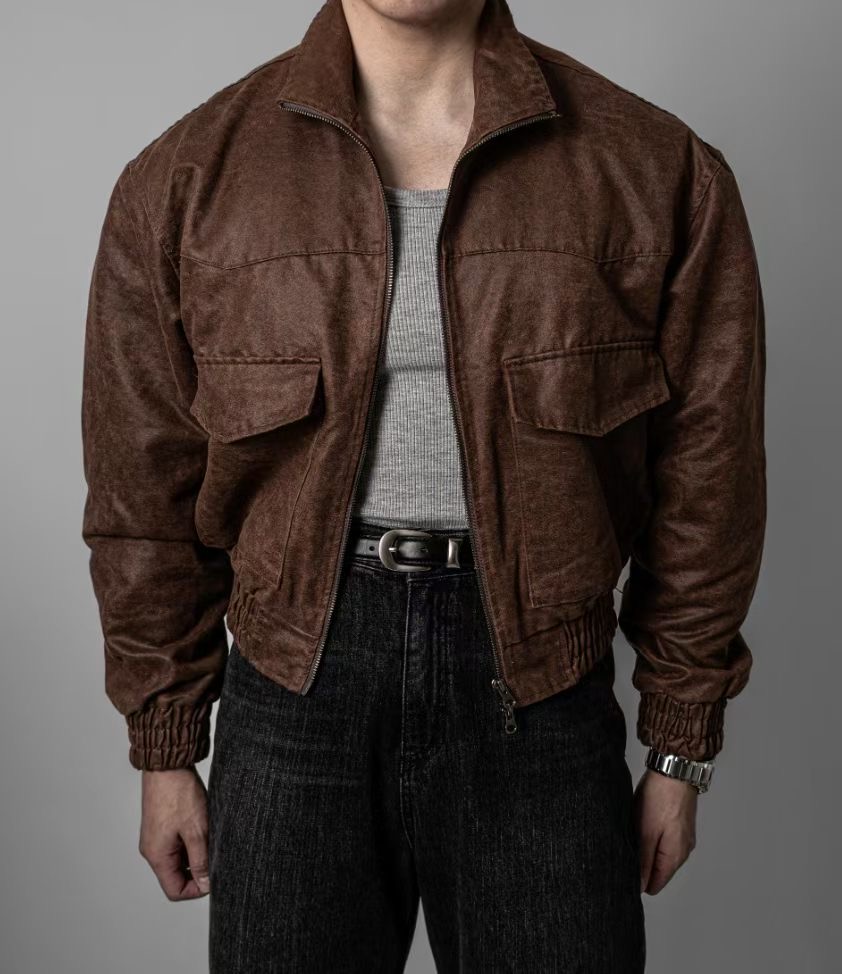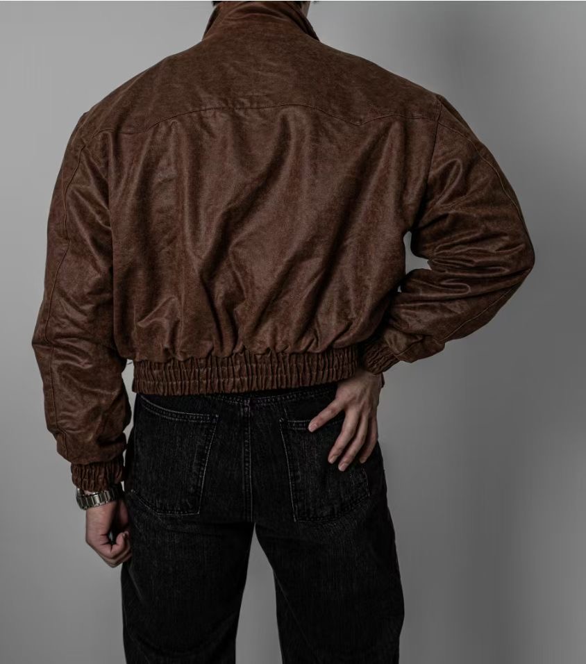 這款夾克選用合成皮革,經由特殊仿舊工藝處理,呈現出細膩的皮革紋理與自然光澤,散發濃厚的復古氛圍。