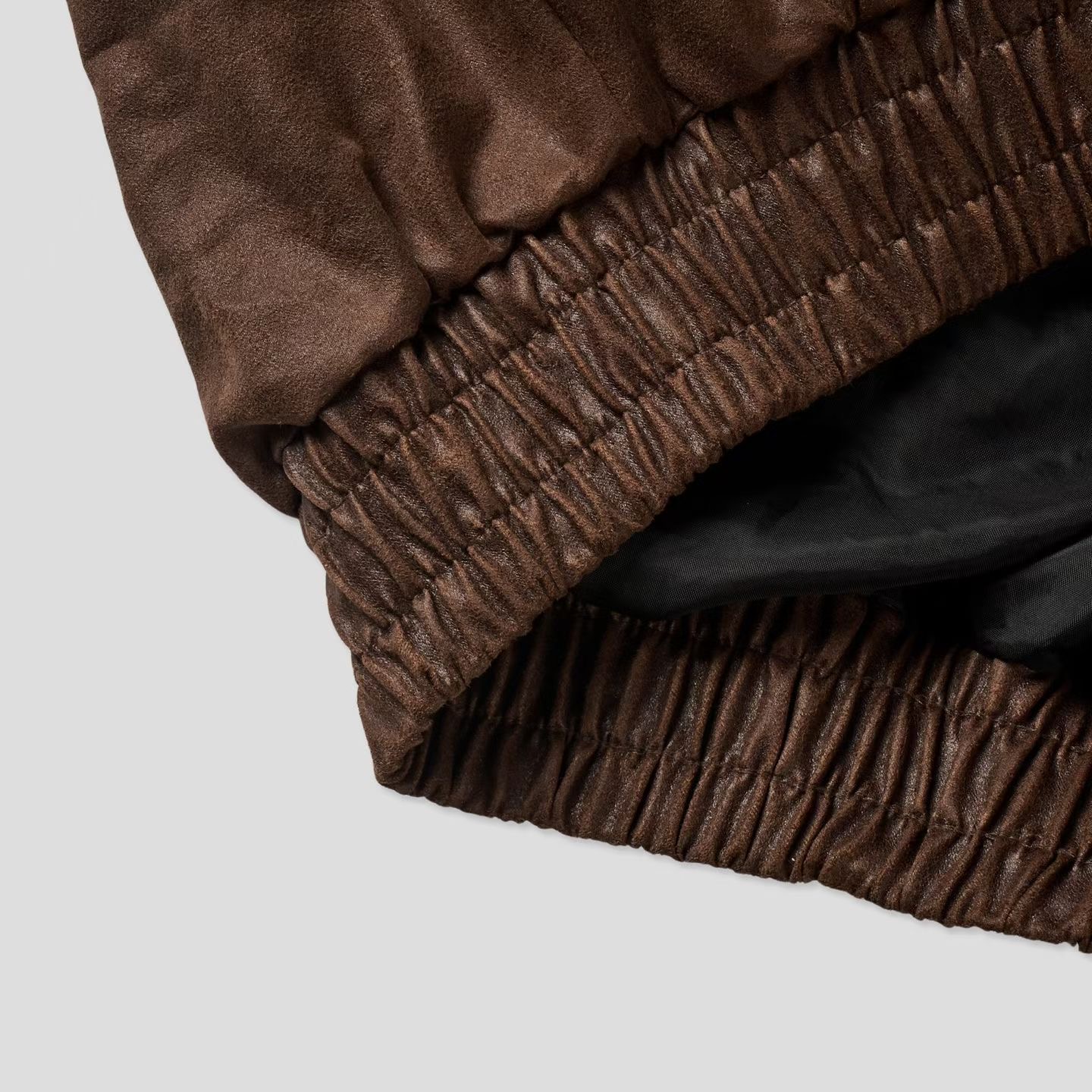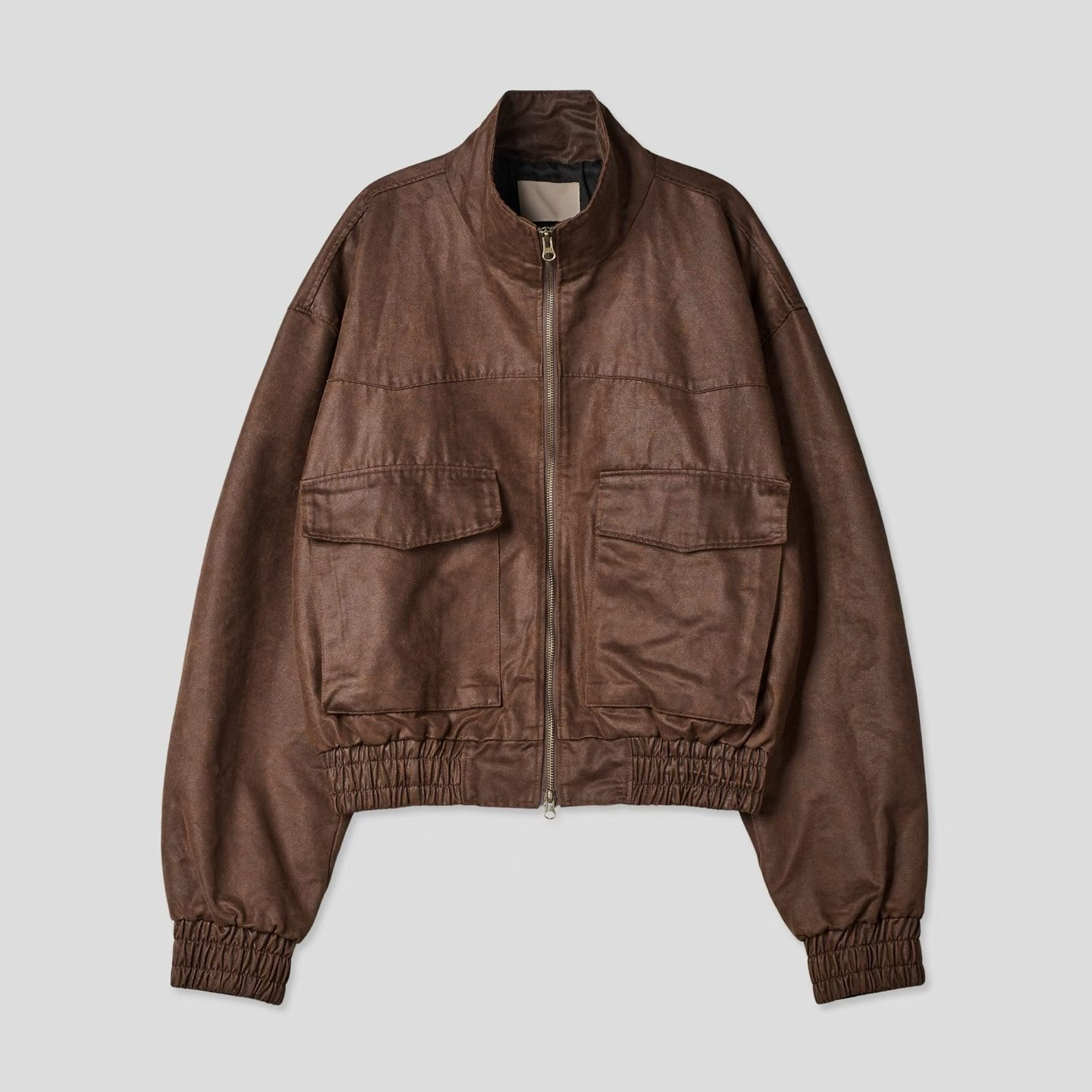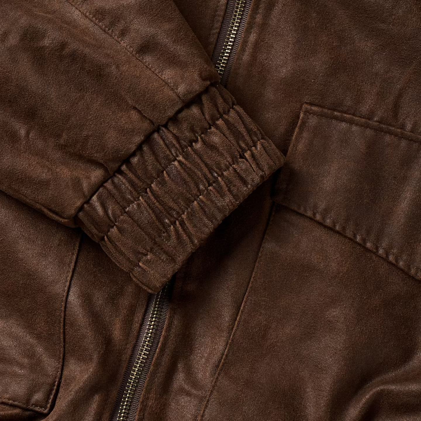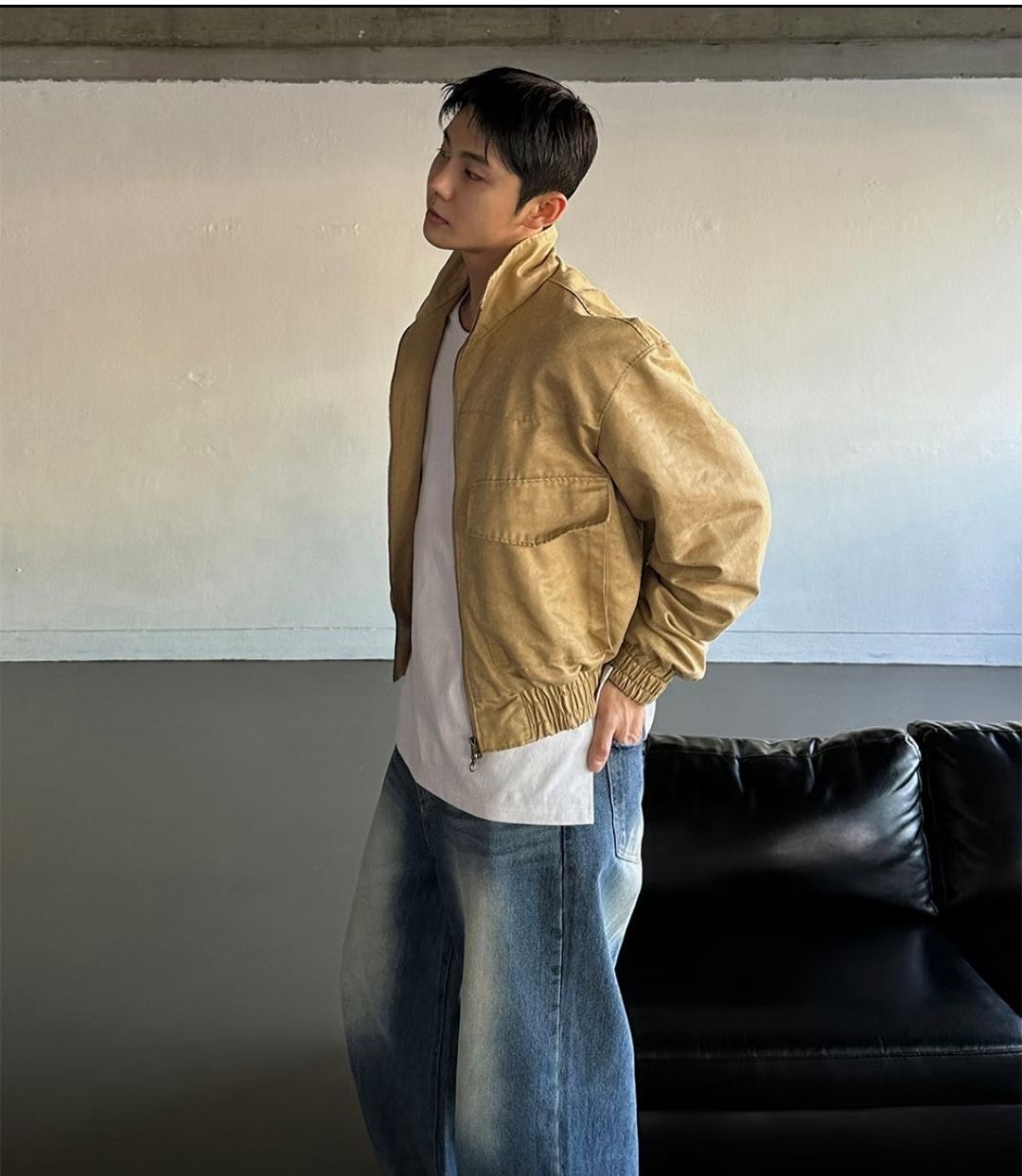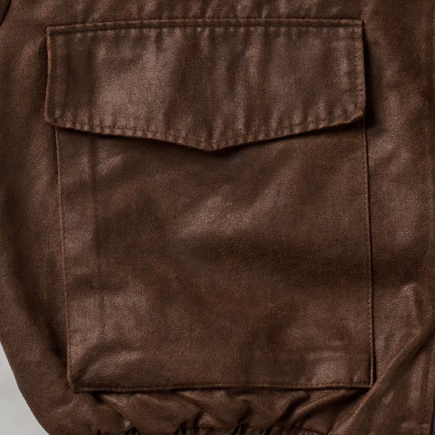 這款夾克選用合成皮革,經由特殊仿舊工藝處理,呈現出細膩的皮革紋理與自然光澤,散發濃厚的復古氛圍。